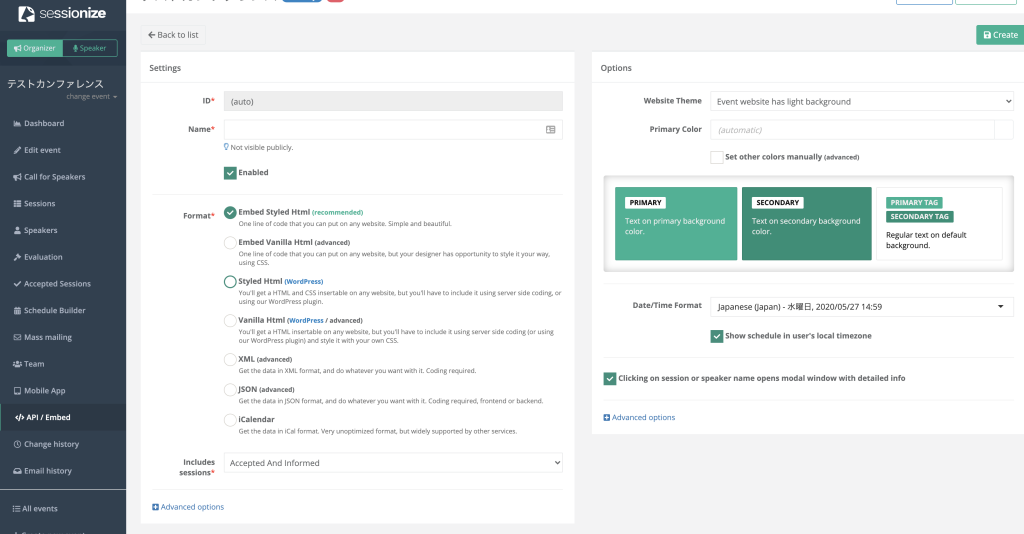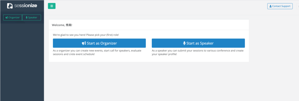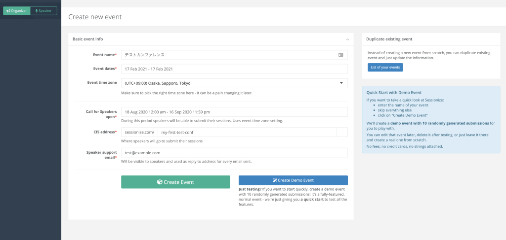sessionizeで作成されたイベントに応募するためのモードと思われる「Speaker」と、CFPやタイムテーブルを利用する「Organizer」の2種類がある様子です。