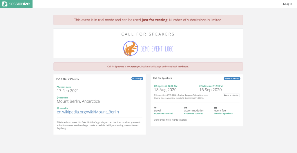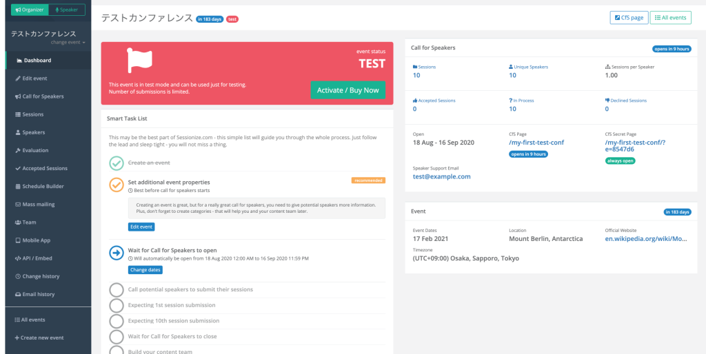 Demoで作った場合のTOPページです。どれくらいのセッション応募があるかや、TODO Listなどが表示されており、なかなかみやすいです。