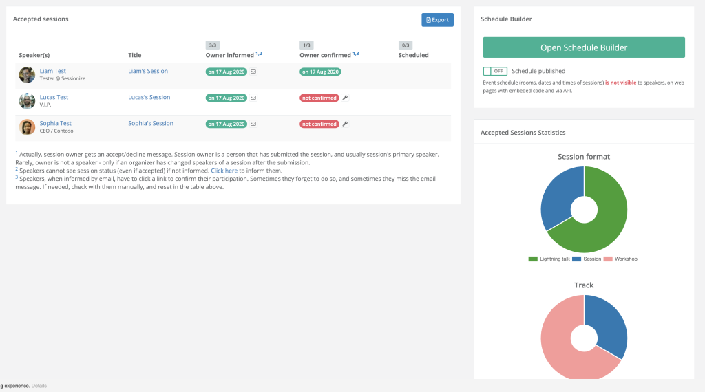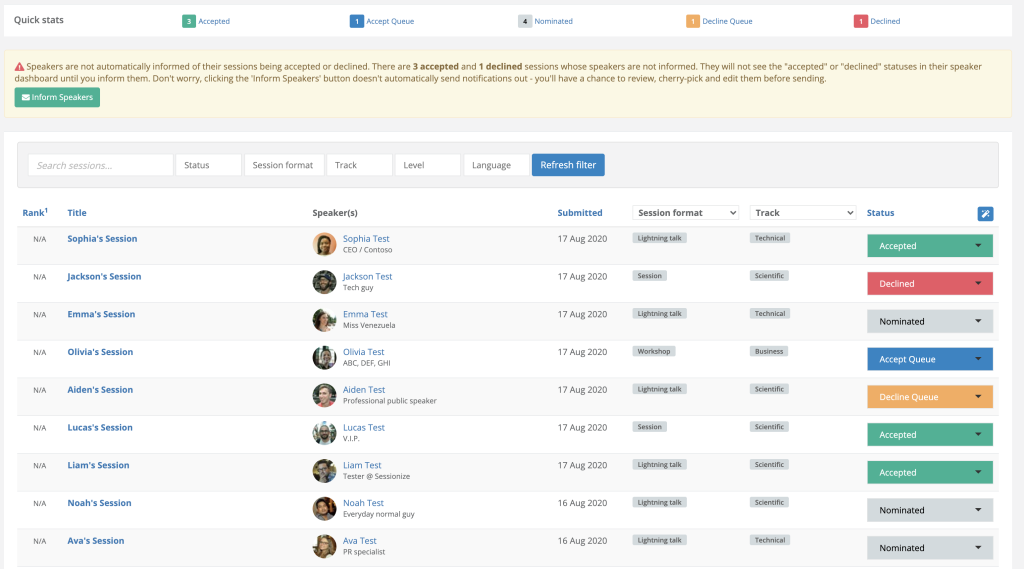 また、Sessionizeが面白いのはスピーカー側の承諾ステータスも見れることです。