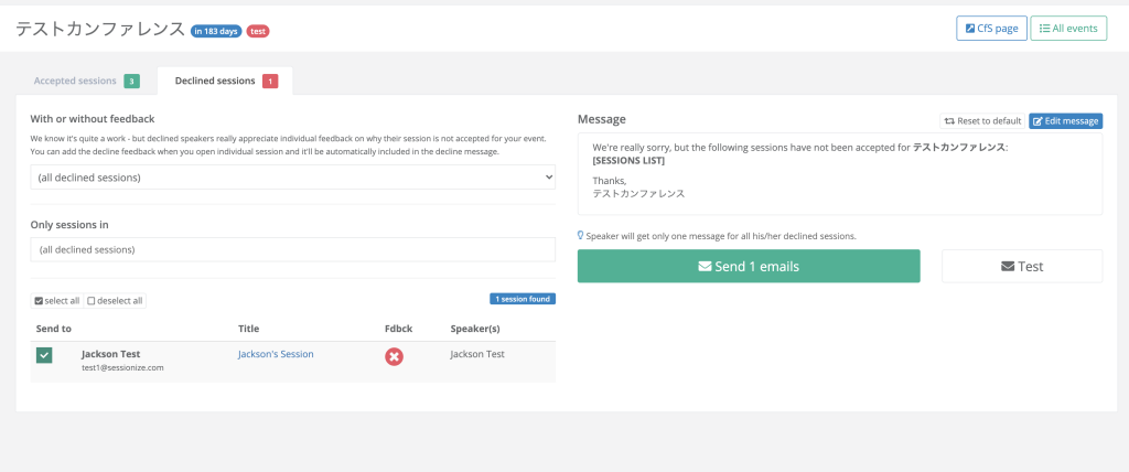採用したスピーカーだけにメールを送ることもできます。