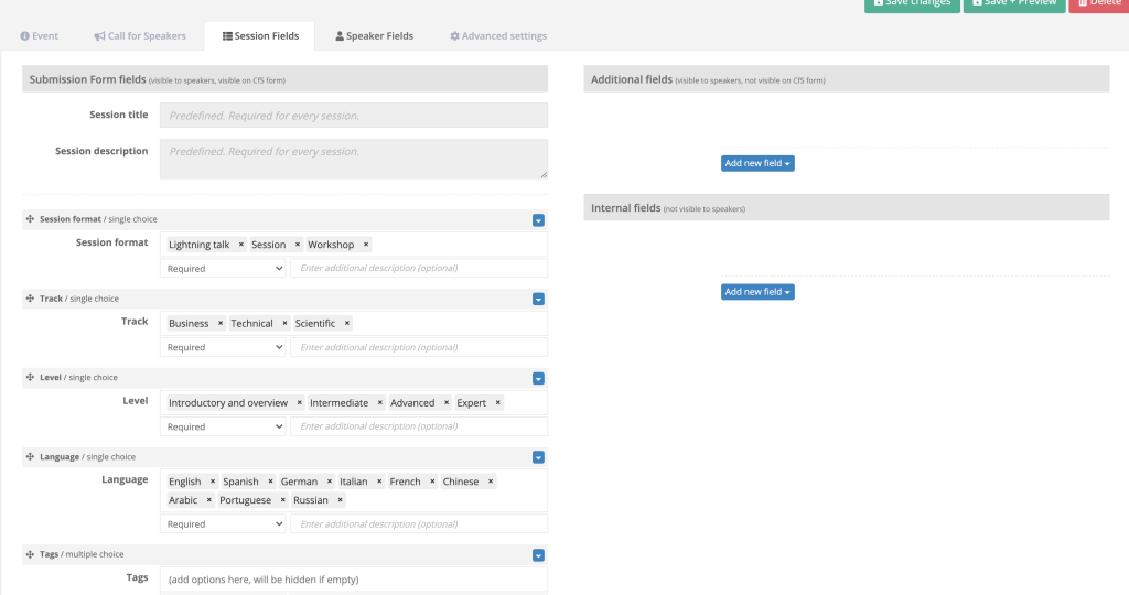 CFPの応募内容などもかなり設定できる様子ですが、残念ながら生成されるページの多言語化は見当たりませんでした。