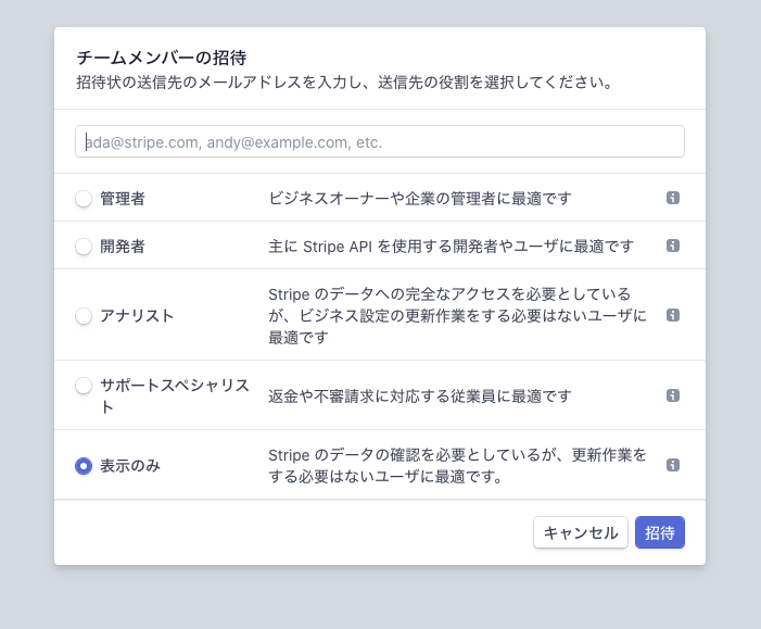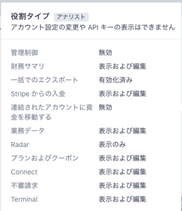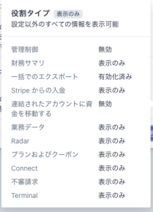 「表示のみ」で作成したユーザーは手動でStripeのデータを触ったりAPIキー / Webhookなどの開発者向け機能を触ることができません。