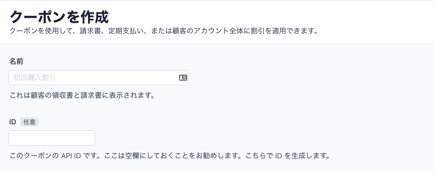 クーポンを発行する際、まず名前を入力します。IDも指定できますが、自動生成してくれる部分ですので、スクリプト側でgrepやfilterしたい場合を除いては空欄で良いと思います。