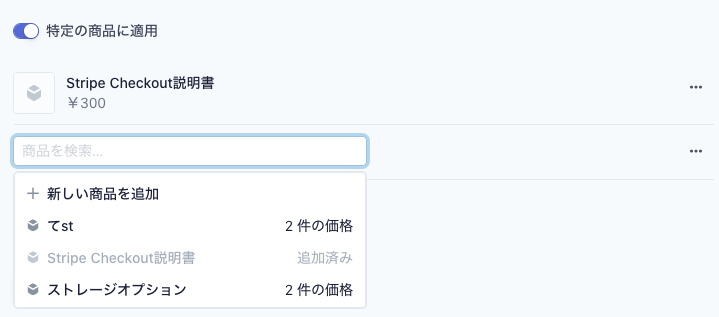 [特定の商品に適用]をオンにすると、指定した商品に対してのみクーポンを設定できます。