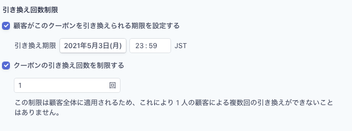 ただし、ここでは「全体での利用期間」や「全体での使用回数」のみ指定可能ですので、「1顧客1回のみ」のような設定はできません。
