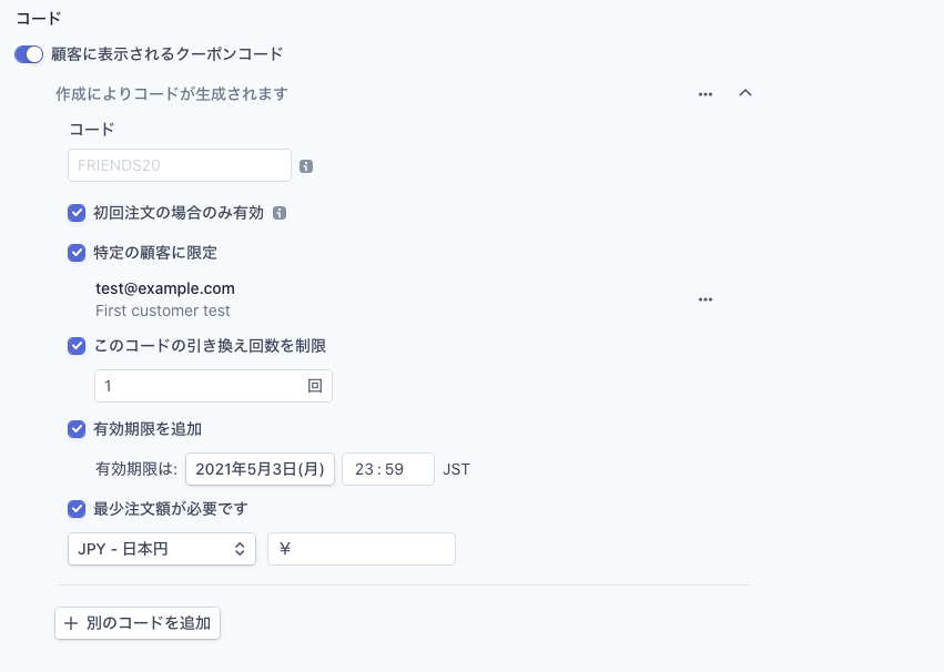が、購入フォームなどでユーザーがコードを入力してクーポンを適用させたい場合、クーポンコードを発行する必要があります。