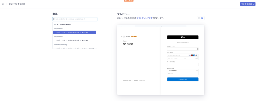 “支払いリンクを作成”をクリックすると、商品を選ぶフォームが表示されます。