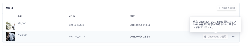 今のところDashboardから作成することができない様子の商品スタイルですが、「SKUを持ち」、「name属性が未設定」の商品はPayment Linksを作成することができません。