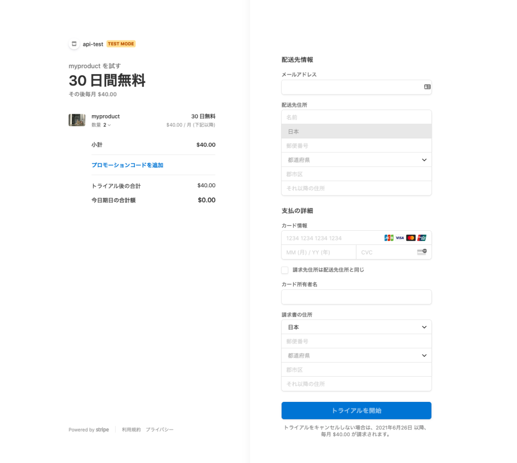 出来上がったページをみると、フリートライアルの強調や請求・配送住所の共通化など、ECとして欲しい機能も揃っていてなかなか良い感じです。