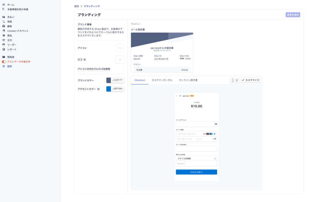 Payment Linksで作成した支払いリンクからアクセスできるページの見た目は、[設定 > ブランディング]から調整できます。