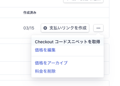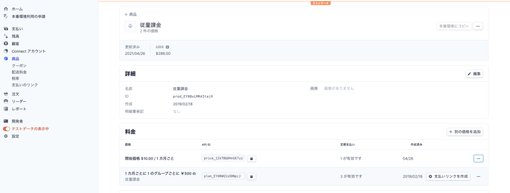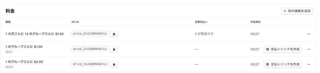すでに商品が作成済みの場合は、商品ページから作成する方が簡単かもしれません。商品ページにアクセスすると、[Payment Linksが作成可能な料金]のみ[支払いリンクを作成]ボタンが表示されます。