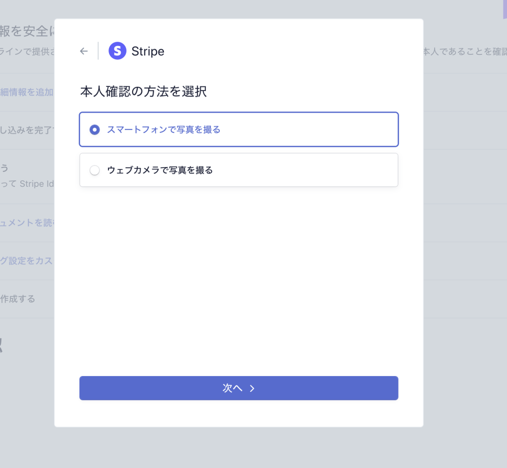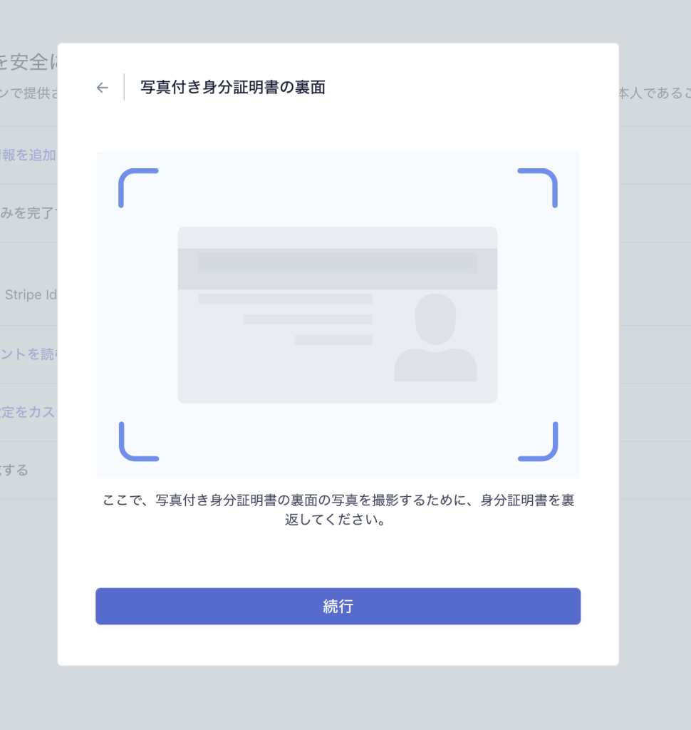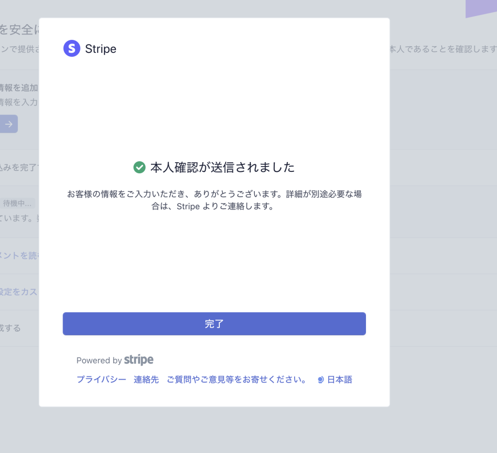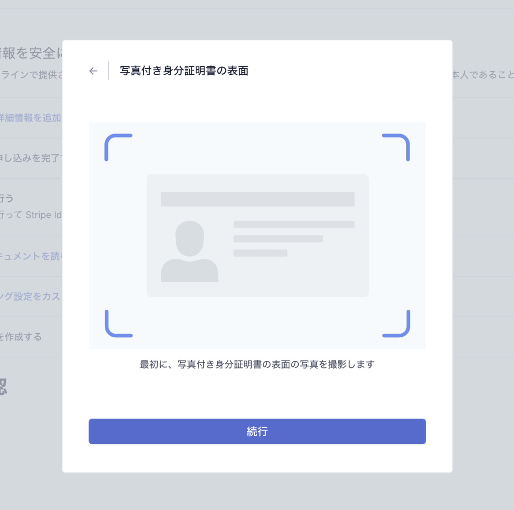 本人確認書類(免許証・パスポートなど)と顔写真の撮影・アップロードを受け付け、記載内容の確認や画像に問題がないかの確認などをStripe側で実施することができます。