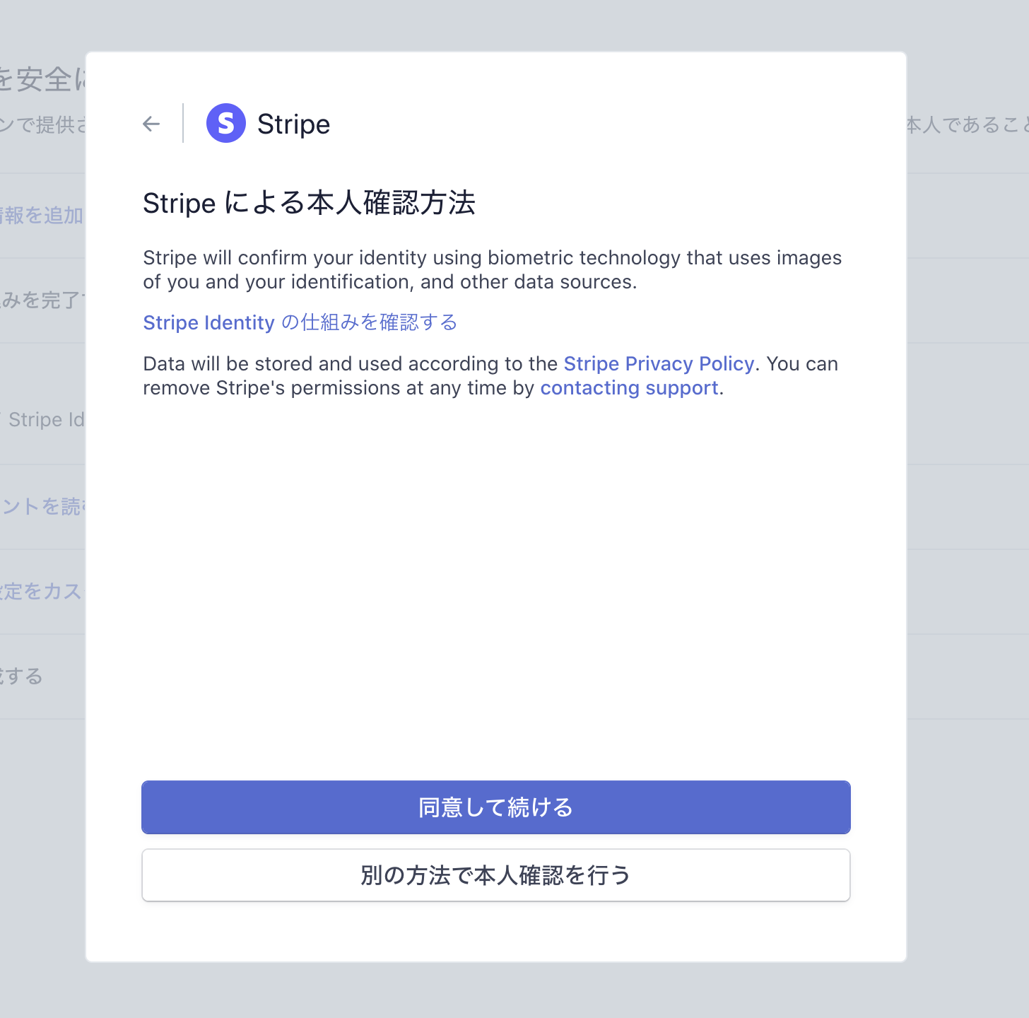 本人確認のセッションURLにアクセスすると、「Stripeを利用して本人確認情報を収集すること」がまず提示されます。「プライバシーポリシーに則り」という文言があるように、Stripe Identityを利用する場合はプライバシーポリシーや利用規約などを正しく整備する必要があります。