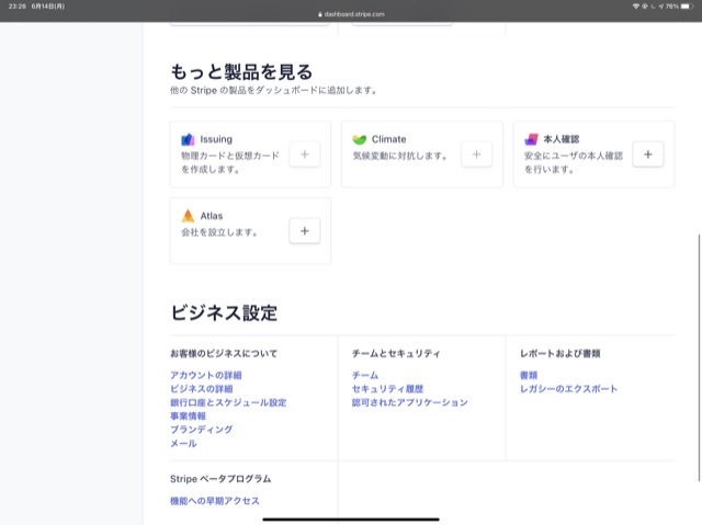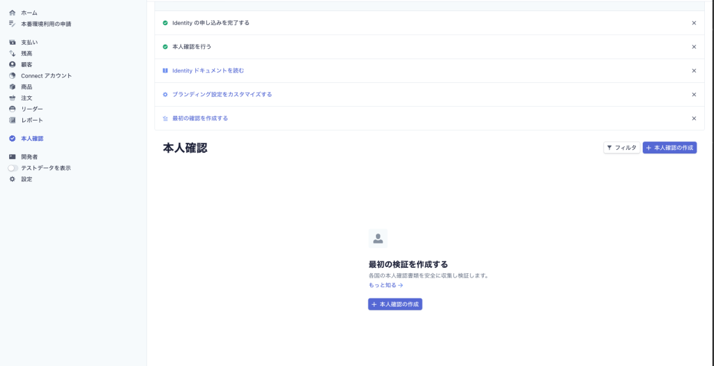 Stripe Dashboardの製品一覧に「本人確認」が増えています。本番利用申請が済んでいるアカウントで、未対応地域から申請した場合は利用できませんが、未申請状態であれば日本からでも有効化できます。