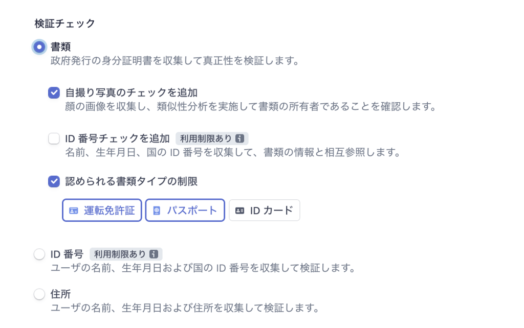 身分証明書を要求したい場合は「書類」を、住所やIDだけで良い場合はそれ以外を選ぶと良いみたいです。IDはおそらく日本ではマイナンバーが該当するかなと思いますが、日本でローンチされた時にどうなるか要チェックです。