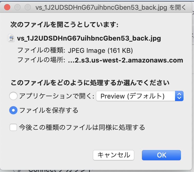 ちなみにアップロードされた書類の確認やダウンロードも実施できます。ダイヤログを見るかぎり、書類はAmazon S3にアップロードされている様子ですね。しかもオレゴン。