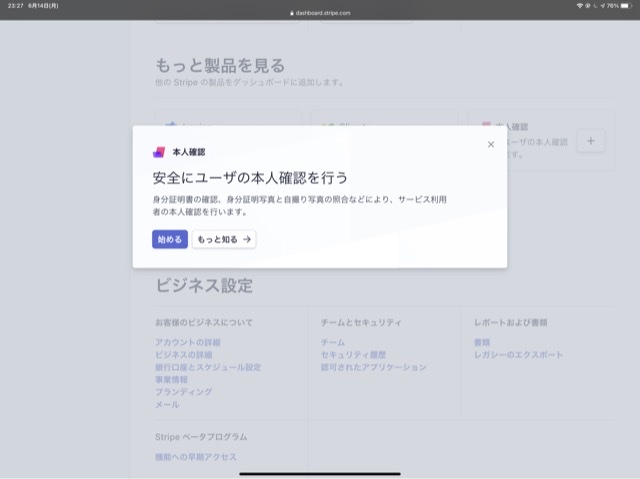 Stripe Dashboardで本人確認を選択
