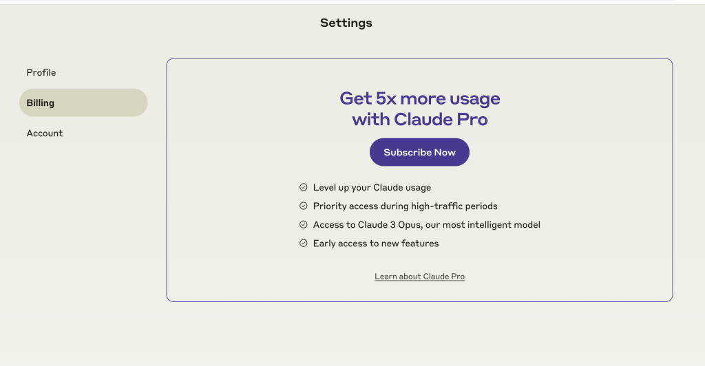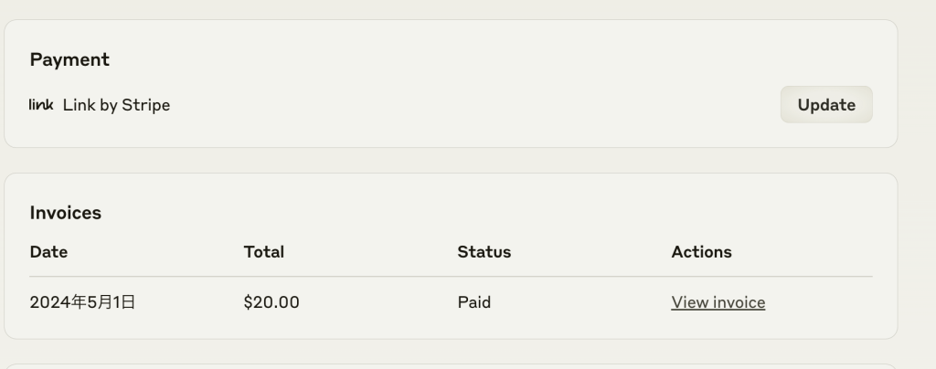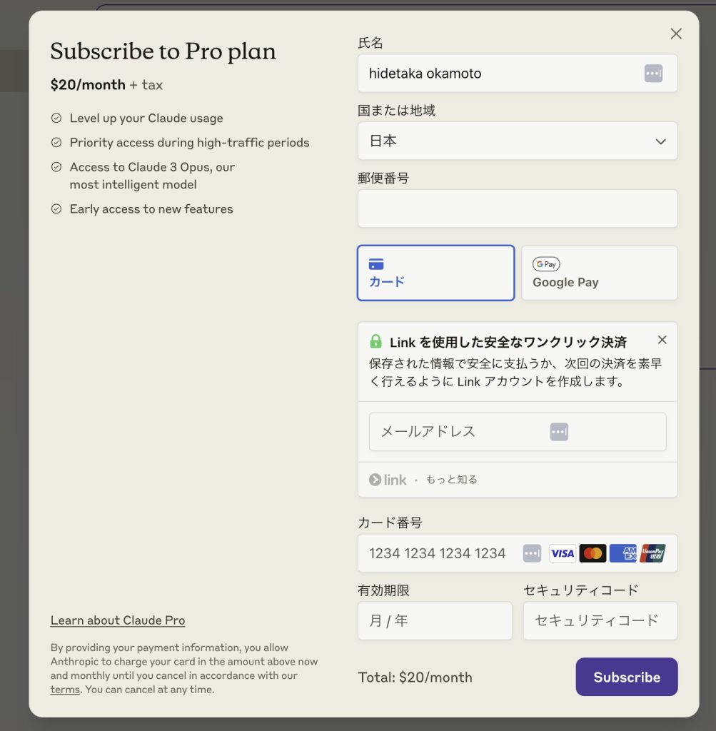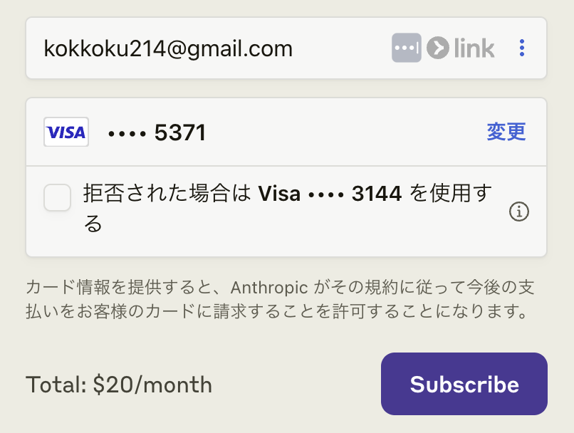 あとはSubscribeボタンを押して申し込みを完了するだけです。Claudeの支払い管理ページにも、Link by Stripe