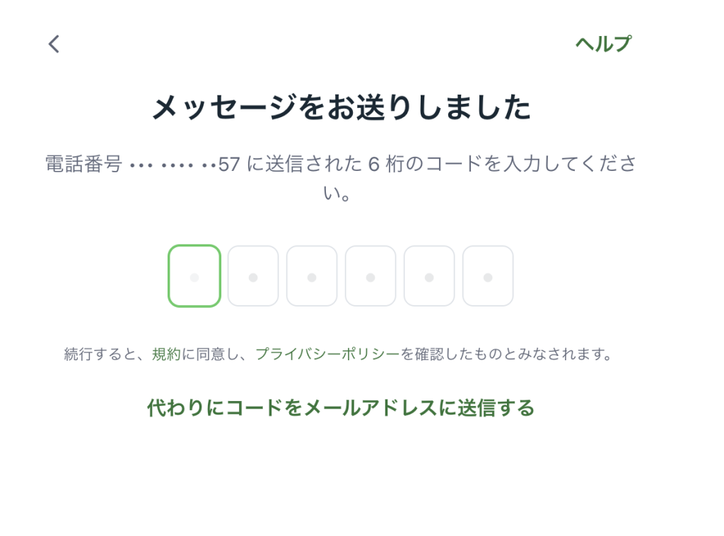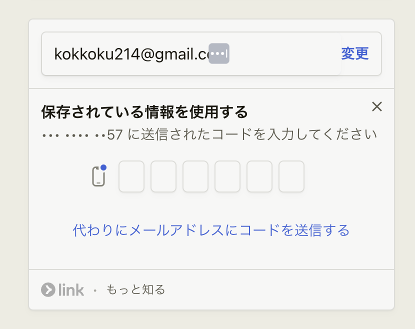 電話番号を入力すると、Linkから6桁のパスワードを含むSMSが届きます。これを入力すると、認証が行われます。メールアドレスでも認証ができますので、もしSMSが届かない・受信できない状況では、こちらを使うとよさそうです。