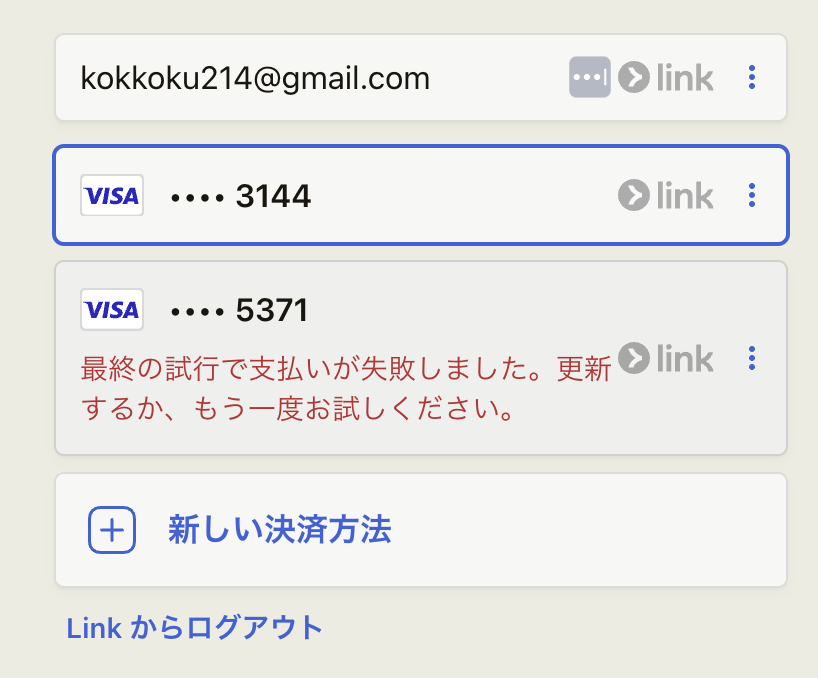 すでにどこかのサイトやサービスの決済フォームで、Linkにカード情報を保存している場合、下の画像のように保存済みのカードが表示されます。決済に失敗した場合用のバックアップカードも指定できるのが面白いですね。