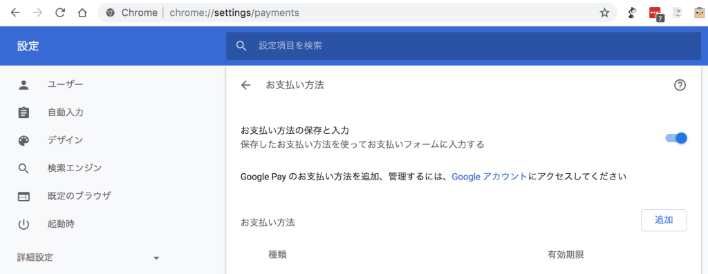 chrome://settings/payments にアクセスすることで、ブラウザに登録された支払い情報の追加・更新・削除ができます。