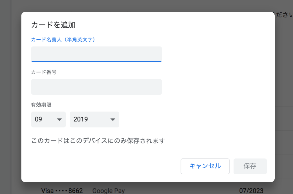 ここで追加を選択すると、カード情報を入力する画面が開きます。