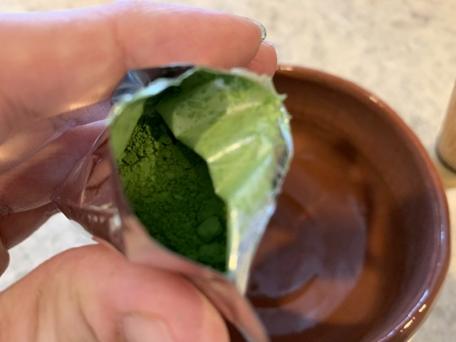 アルミパックを開けると、中には抹茶が入っています。静電気?でほんの少しですが少しパックに引っ付きますので、茶杓やティースプーンでしっかり出してやったほうが良いかもしれません。