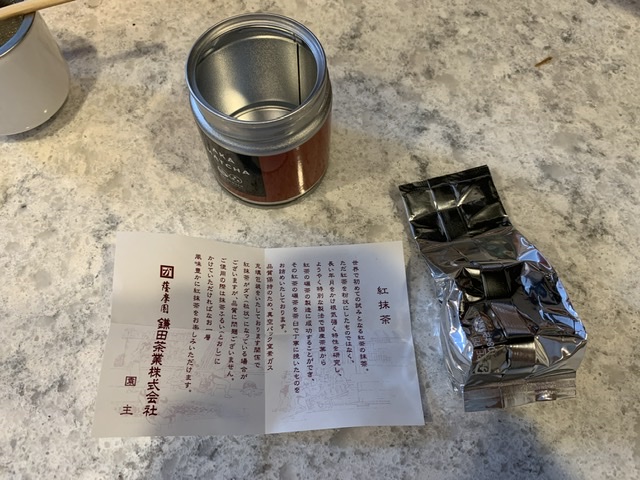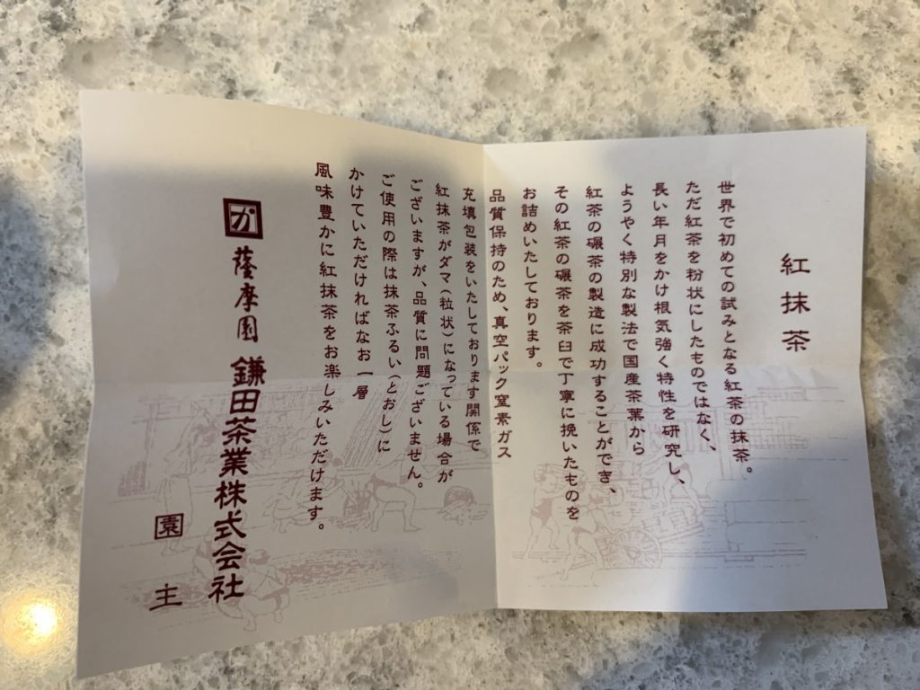 抹茶缶には2点入っていました。紅抹茶についての説明文と、紅抹茶そのものが入った小袋が封入されています。